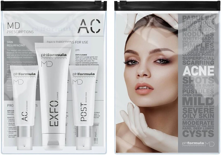 pHformula MD A.C. Homecare Kit — це комплексний домашній догляд для шкіри, схильної до акне, надлишкового себуму, забитих пор і постзапальних слідів. pHformula позиціонує цей набір як вступ до HOMECARE prescriptions, що підтримує професійні resurfacing-процедури. Набір допомагає очищати, м'яко оновлювати, заспокоювати шкіру та покращувати її загальну текстуру.